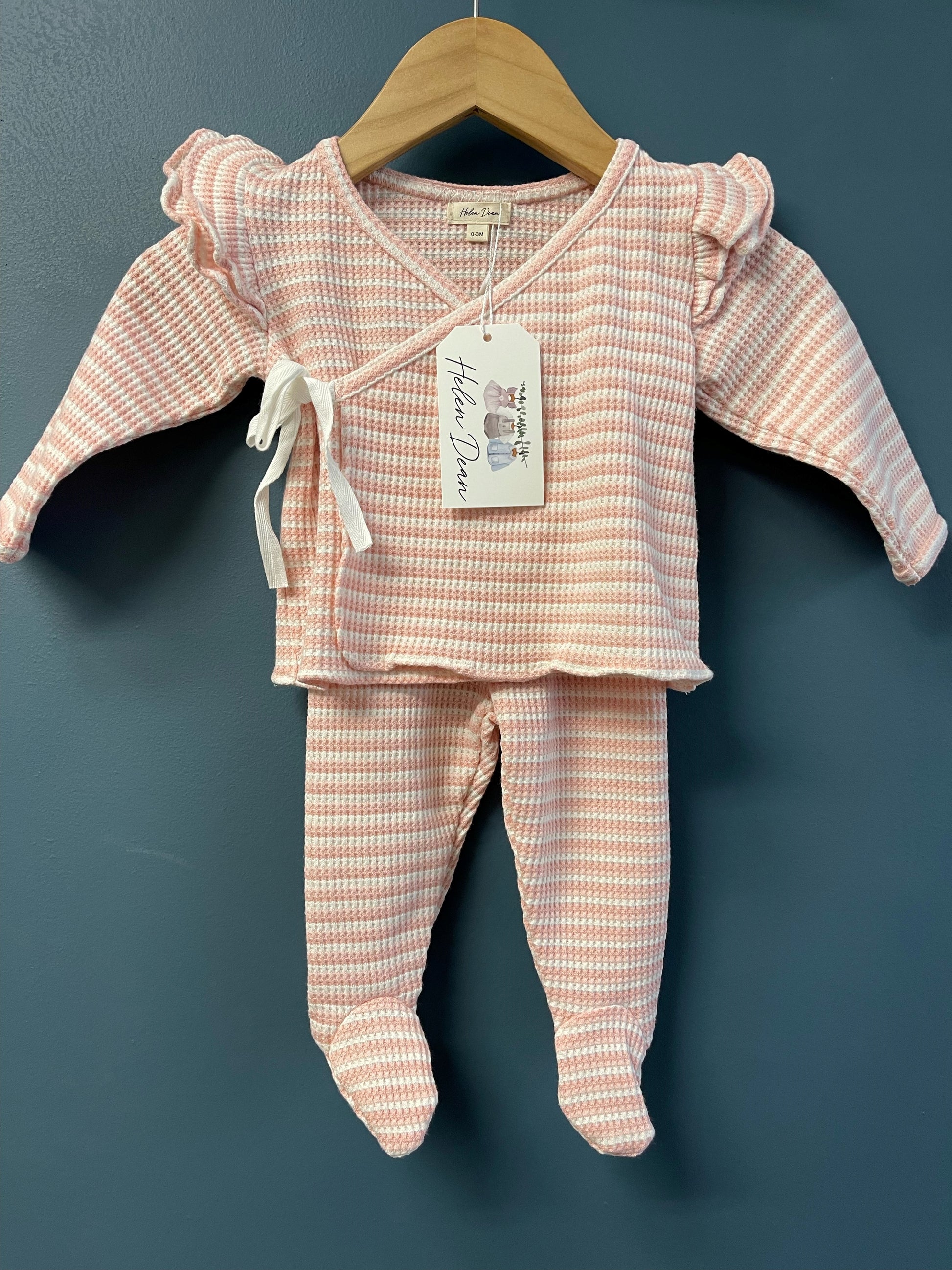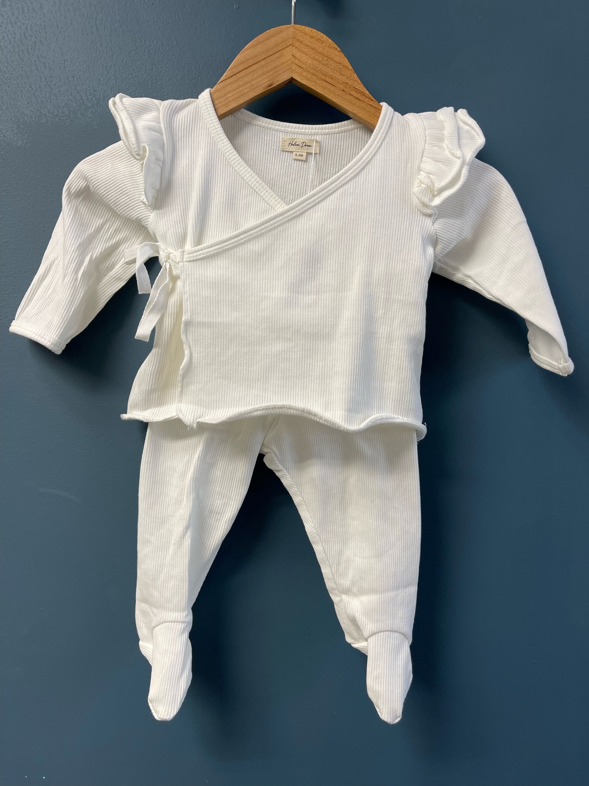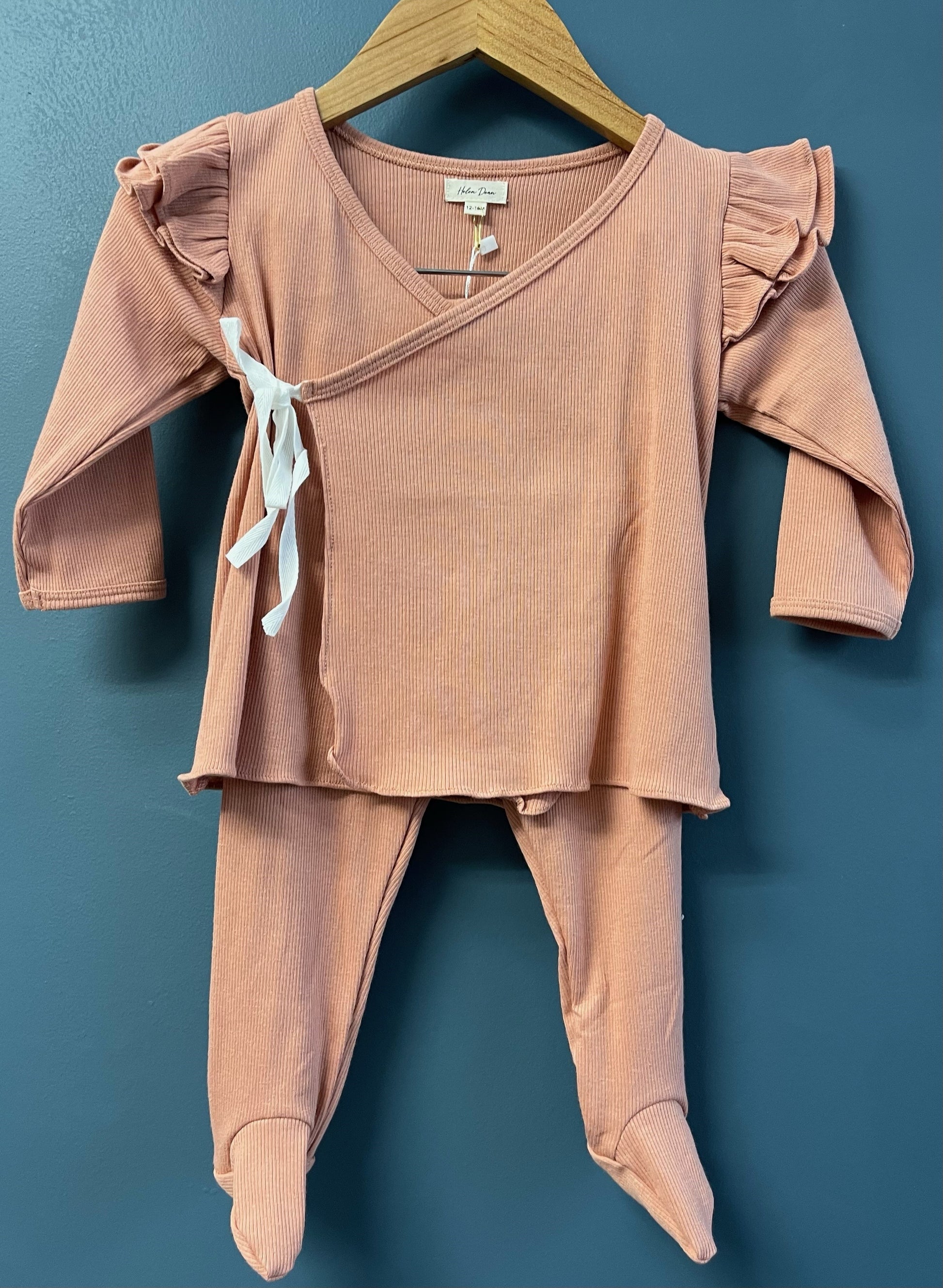 Incredibly soft 2 piece set with footed pants and a side tie ruffle front.